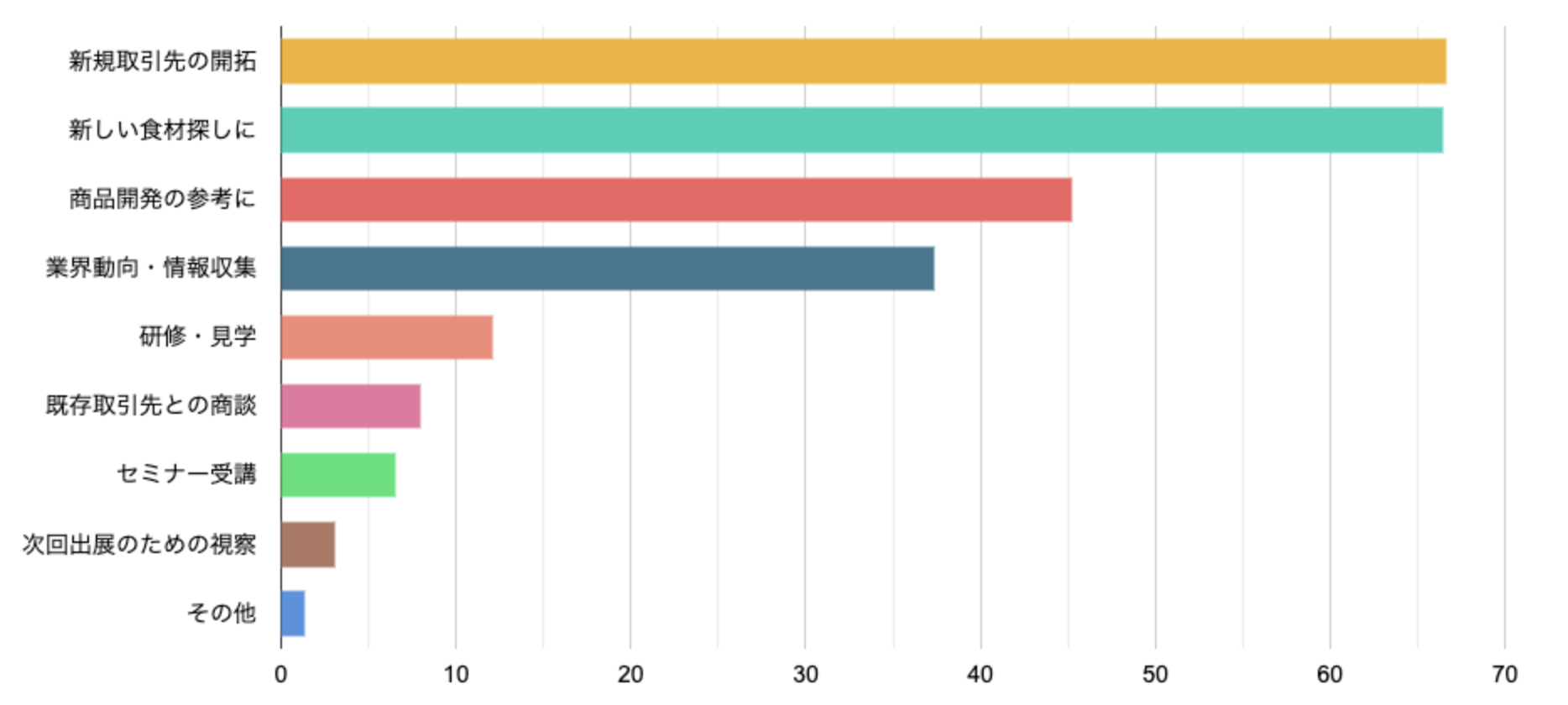 来場者は「新規仕入れ」や「取引先開拓」を目的とした購買意欲の高い方が大半です。特に、日本最大の消費地である首都圏の飲食店関係者が中心のため、関東市場をターゲットとする生産者様には絶好の機会となります。さらに、社長や役員といった決裁権者の比率も高く、その場で具体的な話がまとまりやすいため、スピーディで密度の濃い商談が実現します。